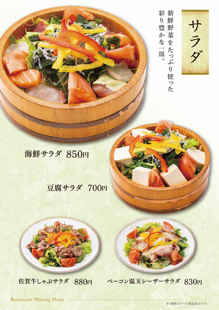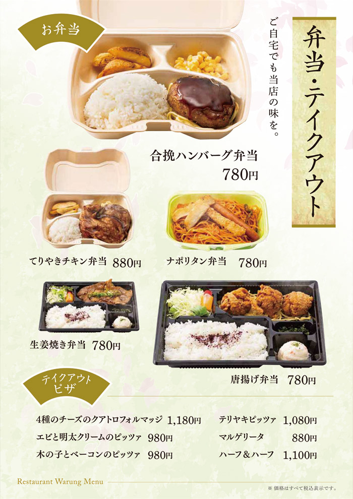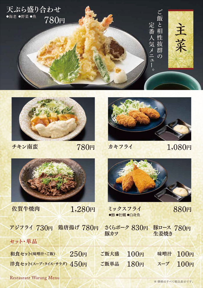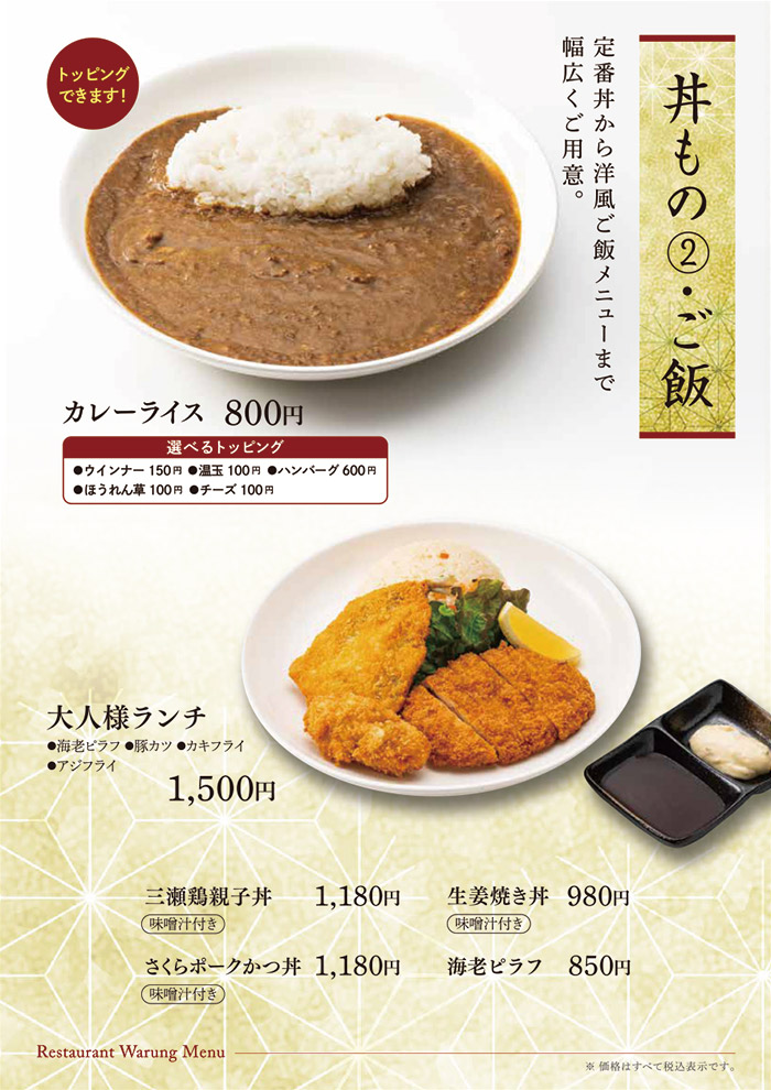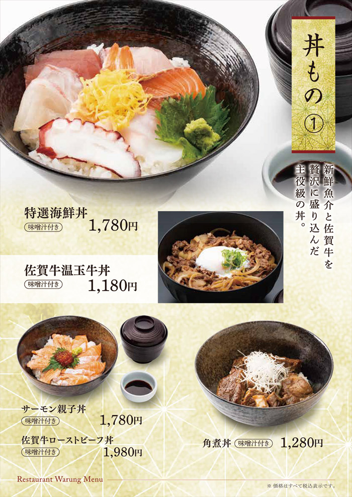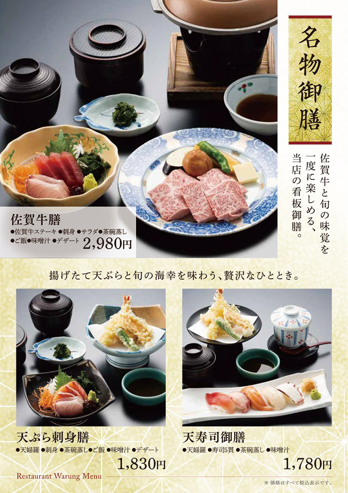 お食事のみのご利用も可能です。 佐賀名物をはじめ、和風洋風と豊富なメニューをご用意して皆様のお越しをお待ち致しております。 アマンディ館内イベントや宴会にもご利用いただける大宴会場もございます。 営業時間 平日・休日 11:00~15:30 (15:00 L.O.) 17:00~21:00 (20:30 L.O.) ※日によって営業時間が変わることがございます。 TAKE OUT MENU 和洋レストラン ワルン テイクアウトメニューのご案内 メニューのご案内 詳細は店舗スタッフまでお問い合わせください。