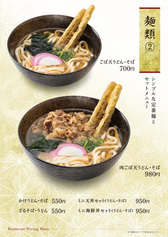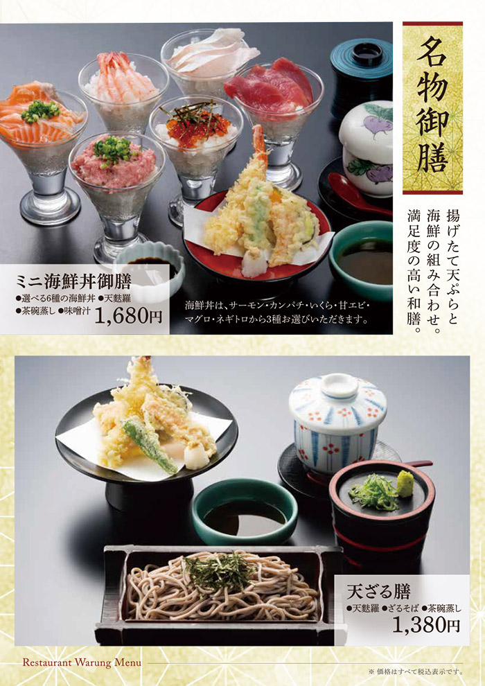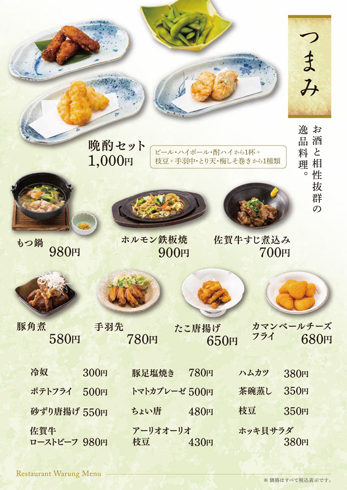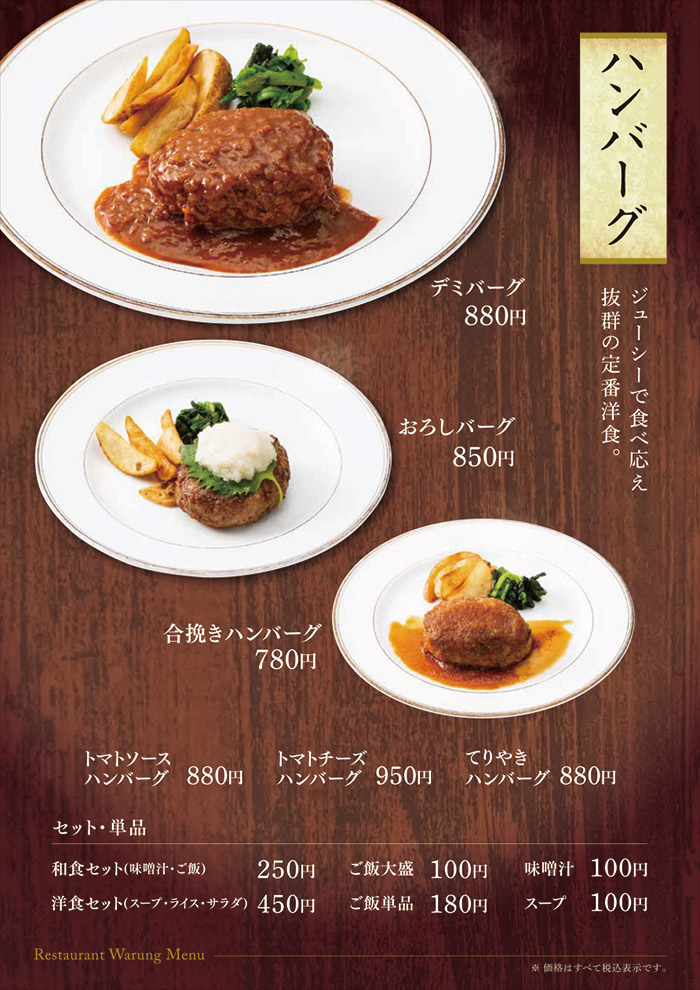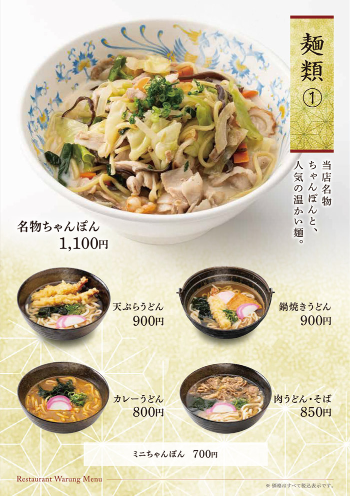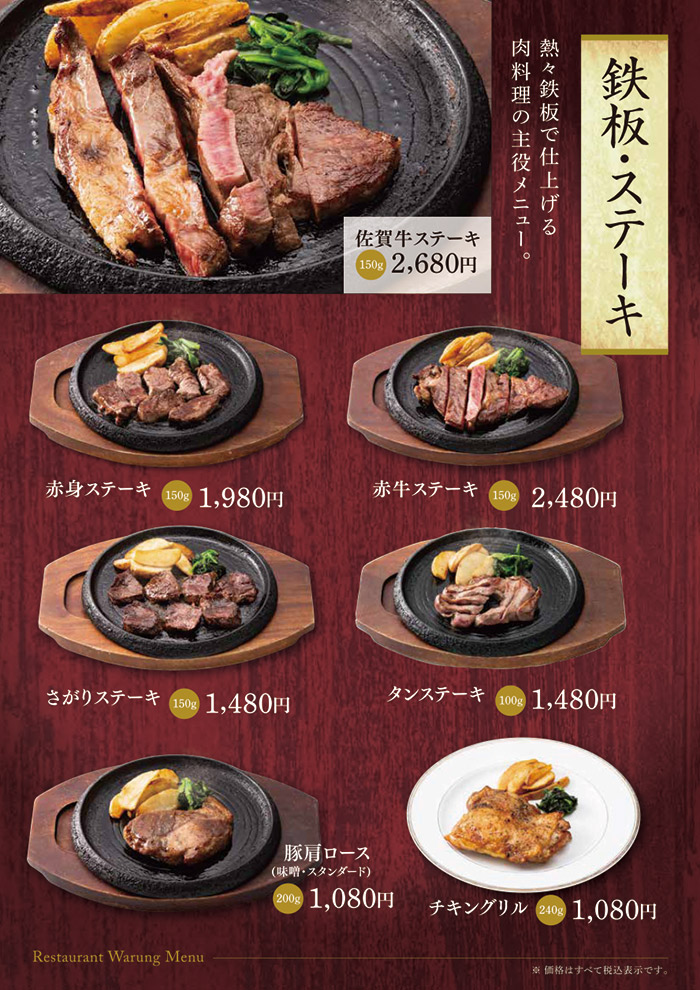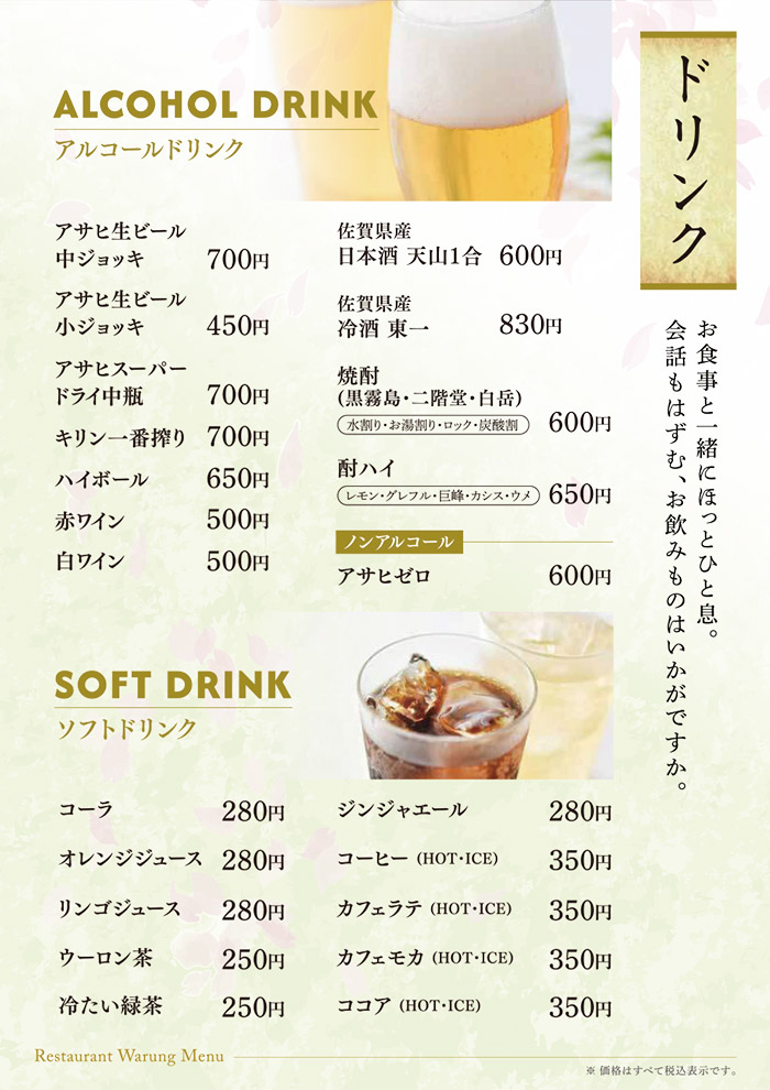 お食事のみのご利用も可能です。 佐賀名物をはじめ、和風洋風と豊富なメニューをご用意して皆様のお越しをお待ち致しております。 アマンディ館内イベントや宴会にもご利用いただける大宴会場もございます。 営業時間 平日・休日 11:00~15:30 (15:00 L.O.) 17:00~21:00 (20:30 L.O.) ※日によって営業時間が変わることがございます。 TAKE OUT MENU 和洋レストラン ワルン テイクアウトメニューのご案内 メニューのご案内 詳細は店舗スタッフまでお問い合わせください。